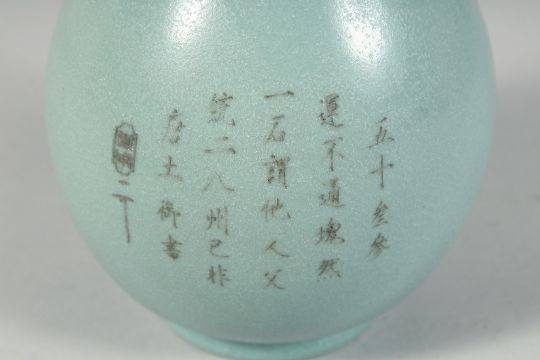 A CHINESE CELADON GLAZE PORCELAIN VASE, the body with incised characters to the side, 26cm high.