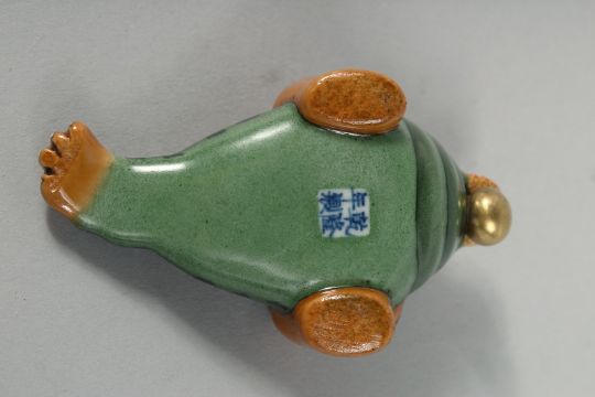 A CHINESE AQUATIC BEAST FORMED PORCELAIN SNUFF BOTTLE AND STOPPER, the base with four-character mark, 9cm long.