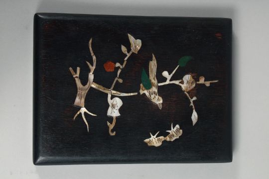 A CHINESE STONE INKWELL IN A FITTED HARDWOOD BOX, the box inlaid with mother of pearl decoration, ink stone 19cm x 13.5cm.