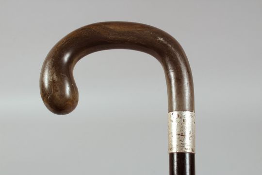 AN ANTIQUE RHINO HORN HANDLE WALKING STICK, with silver band, 90cm long.**Please note: this item can only be sold within the UK**