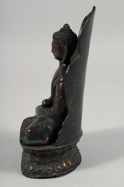 A BRONZE FIGURE OF SEATED BUDDHA, rested on a detachable base, 22cm high overall.