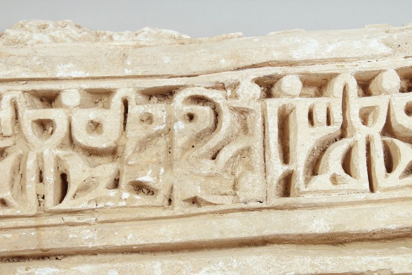 A LARGE HEAVY SELJUK OR GHAZNAVID STUCCO CARVED STONE PANEL, possibly 10/11 AD (untested), with carved Islamic inscription, weight 22.3kg, 57cm x 40cm.