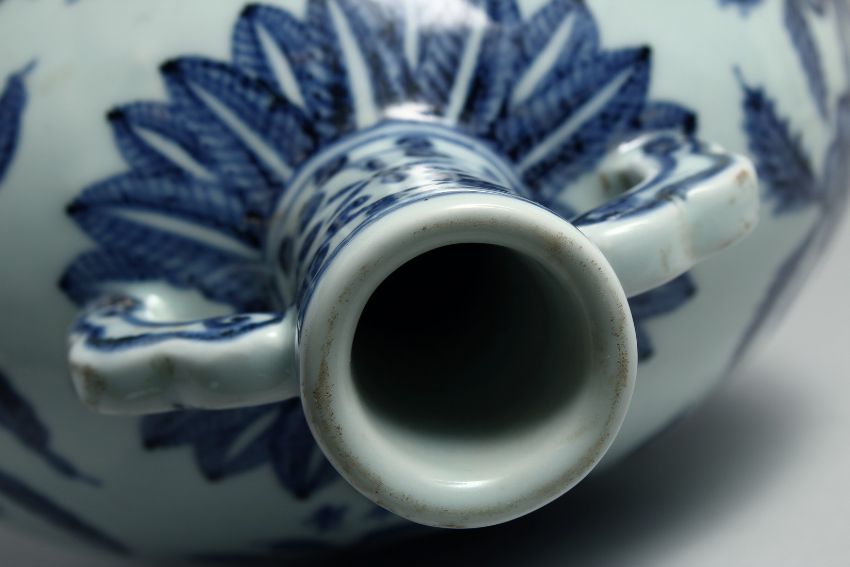 A CHINESE BLUE AND WHITE PORCELAIN TWIN HANDLE MOON FLASK, decorated with sprays of various blossoms, bearing a six-character mark, 27.5cm high.