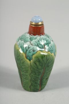 A CHINESE PAK CHOI FORMED PORCELAIN SNUFF BOTTLE AND STOPPER, the base with four-character mark, 7.5cm high.