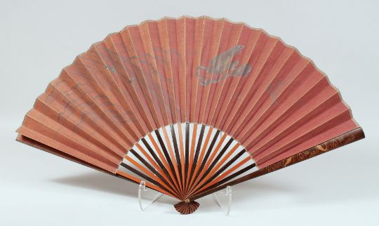 A JAPANESE LACQUERED WOOD FOLDING FAN, the lacquered guards decorated with carp and insects.
