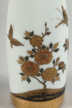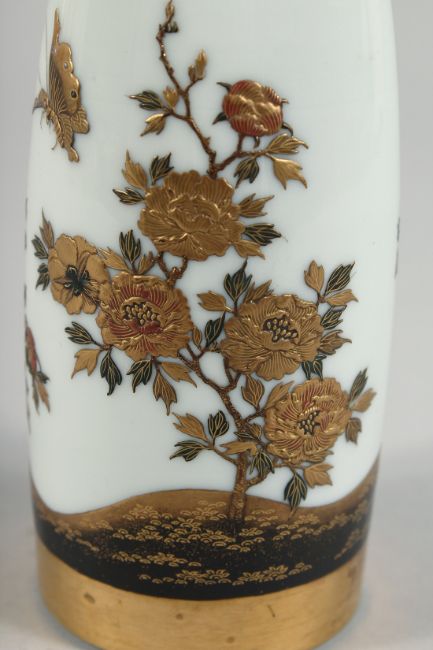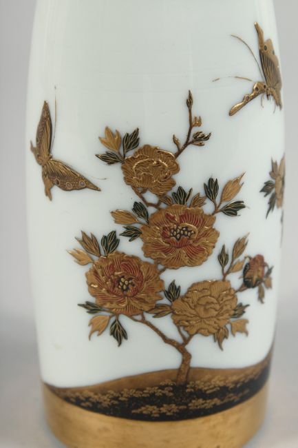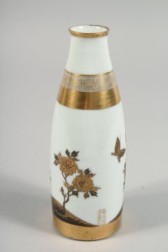 A SMALL JAPANESE PORCELAIN VASE, with gilt work decoration depicting flowers and butterflies, signed to the side, 18cm high.