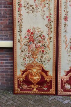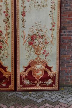 A GOOD PAIR OF LARGE EARLY/MID 20TH CENTURY BRUSSELS NEEDLEWORK PANELS, cream ground, decoration with a flower filled basket suspended from a ribbon and bow, above a flower filled urn on a classical shell base, within an egg and dart border, mounted on a framed backing board.