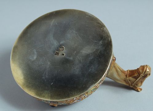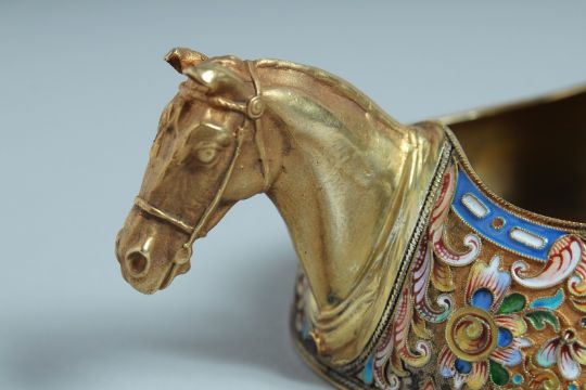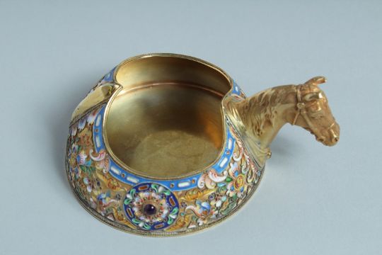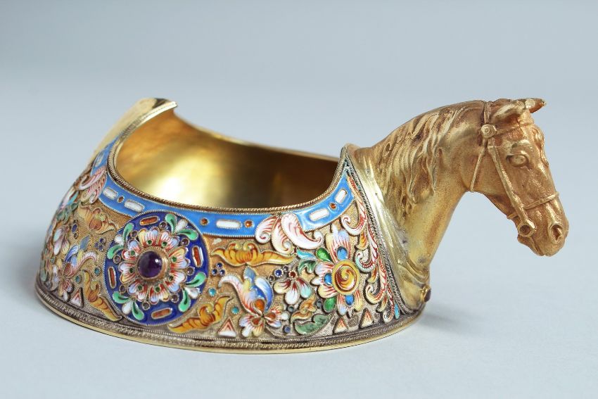 A SUPERB RUSSIAN SILVER GILT AND ENAMEL KOVSCH with a horse's head.