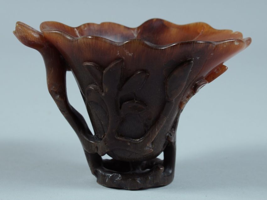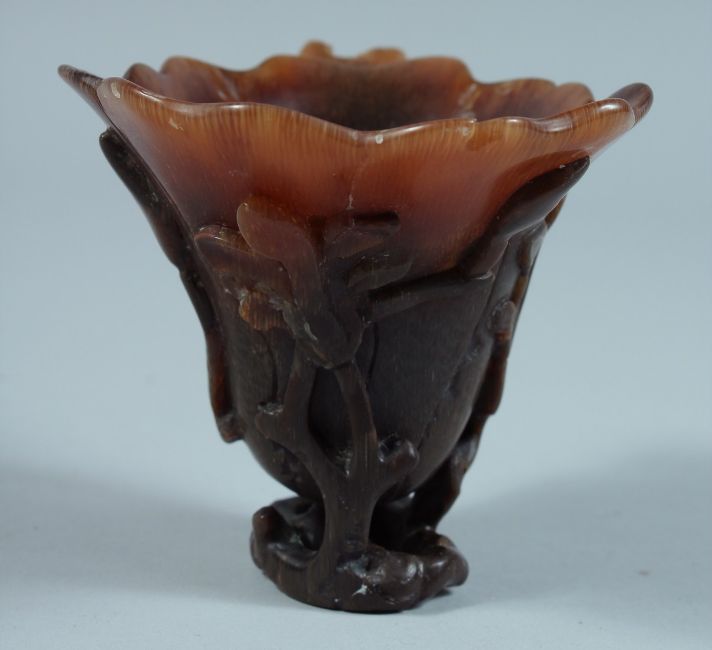 AN 18TH - 19TH CENTURY RHINO LIBATION CUP as a lotus flower with leaves.