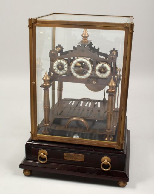 A CONGREAVE BRASS ROLLING BALL CLOCK in a glass case.