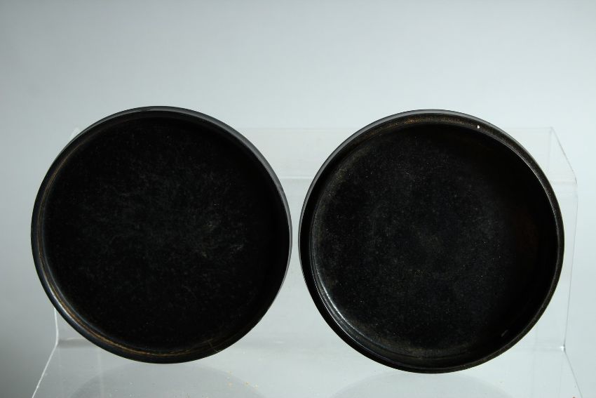 TWO VICTORIAN PAPIER MACHE CIRCULAR BOXES AND COVERS.