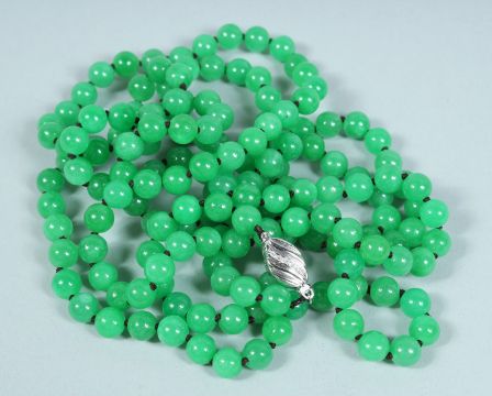 A STRING OF JADE BEADS, long row with white gold clasp.