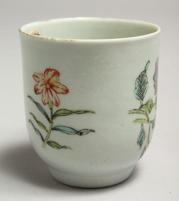 A CHAFFERS LIVERPOOL COFFEE CUP painted with Oriental style flowers in famille verte palette.
