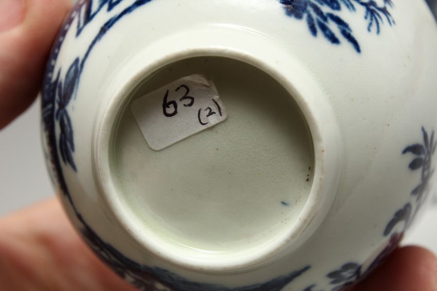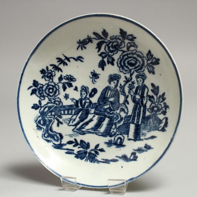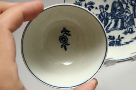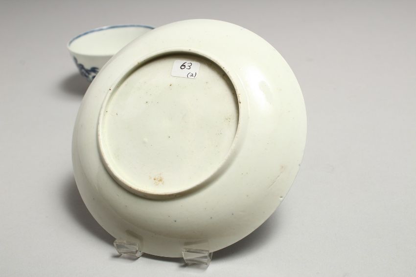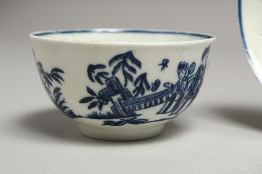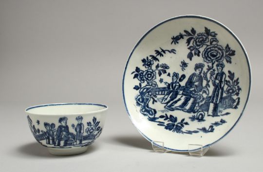 A CHRISTIANS LIVERPOOL TEA BOWL AND SAUCER printed with the Three Ladies pattern in blue under glaze.