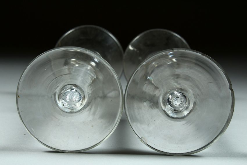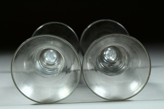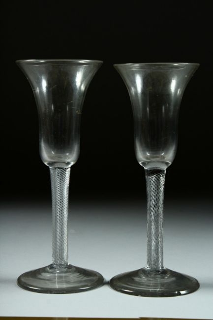 A PAIR OF GEORGIAN WINE GLASSES with inverted shaped bell bowls and air twist stems.