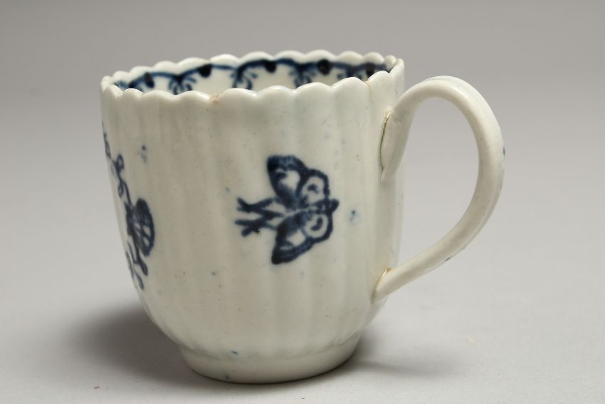 A JOHN PENNINGTON REEDED COFFEE CUP painted with flowers in underglaze blue.
