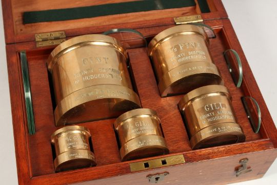 A SET OF SIX BRASS MEASURES, pint to a 1/4 gill, in a rectangular case.