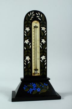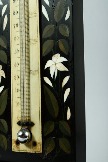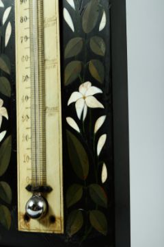 A GOOD VICTORIAN DERBYSHIRE ASHBY MARBLE THERMOMETER inlaid with flowers with ivory dial (Certificate applied for).