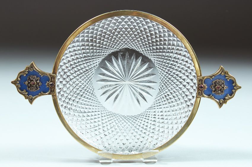 A SUPERB RUSSIAN SILVER ENAMEL CRYSTAL KOVSCH, set with diamonds.