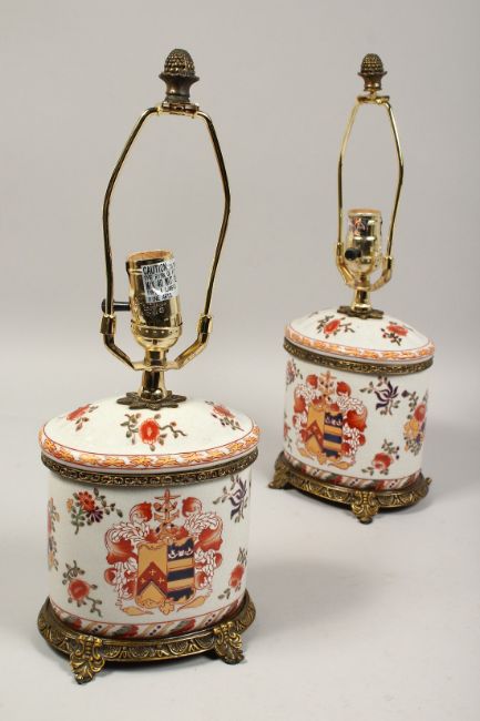 A PAIR OF ARMORIAL PORCELAIN OVAL LAMPS.
