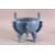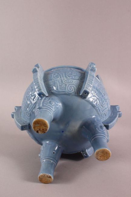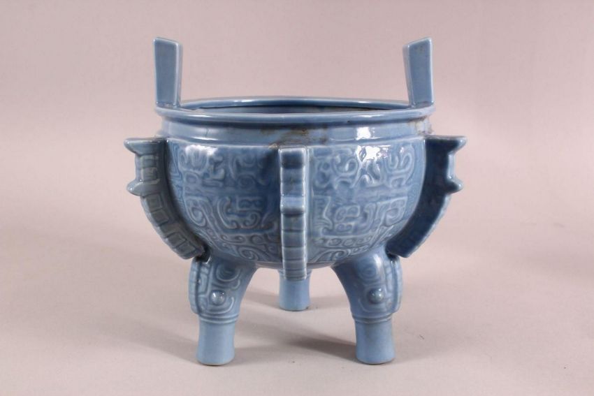 AN UNUSUAL CHINESE BLUE GLAZED PORCELAIN CENSER, with twin handles, body with archaic decoration, stood upon tripod elephant mask feet.