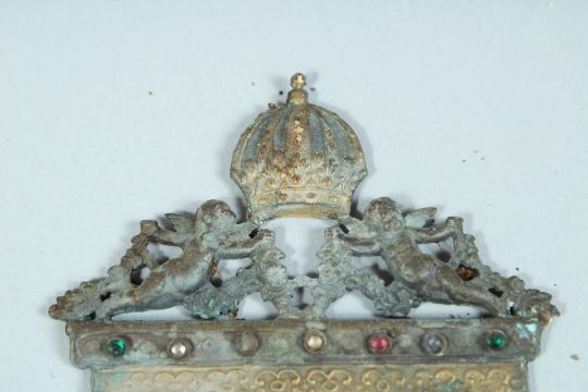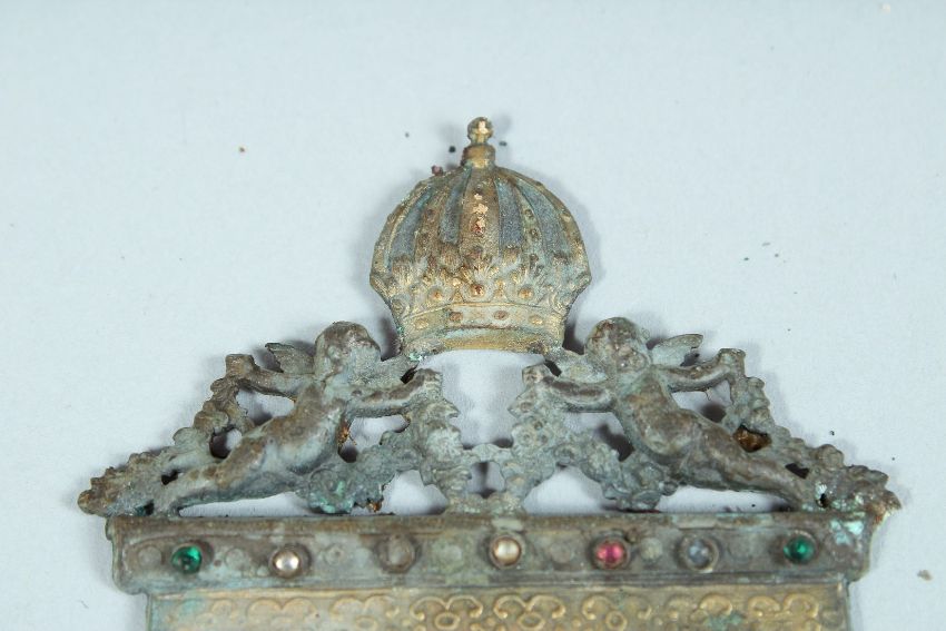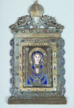 A SUPERB QUALITY GILT AND ENAMEL ICON, the metal frame with cupids and crown.