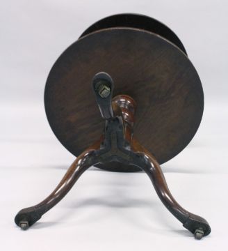 A GEORGIAN MAHOGANY CIRCULAR TWO TIER DUMB WAITER centre turned support ending in tripod legs with pad feet and brass castors.