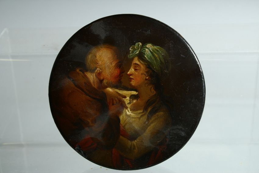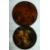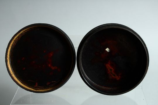TWO VICTORIAN PAPIER MACHE CIRCULAR BOXES AND COVERS.
