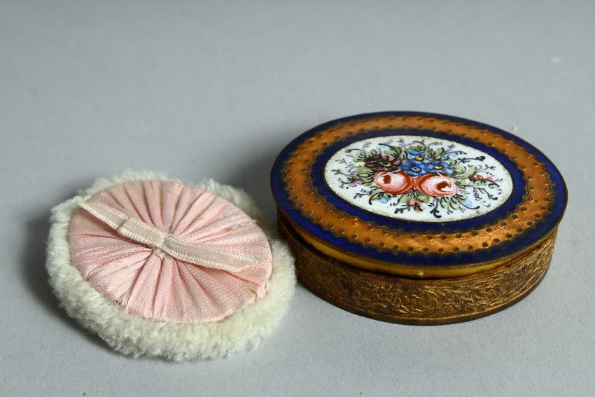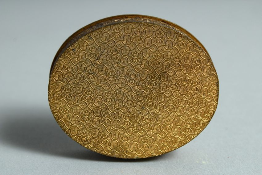 A SMALL GILT METAL OVAL PATCH BOX with enamel top.