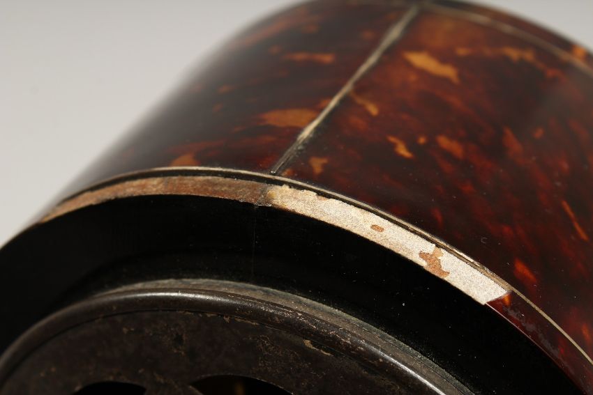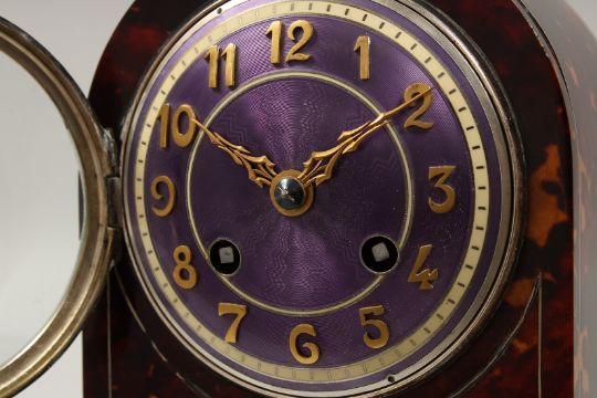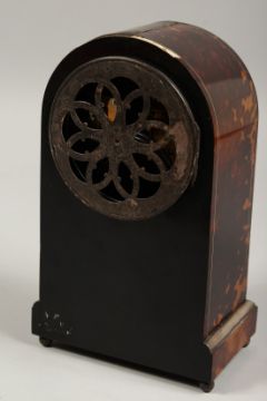 A GOOD TORTOISESHELL CASED CLOCK with blue enamel face, the case with garlands and flowers