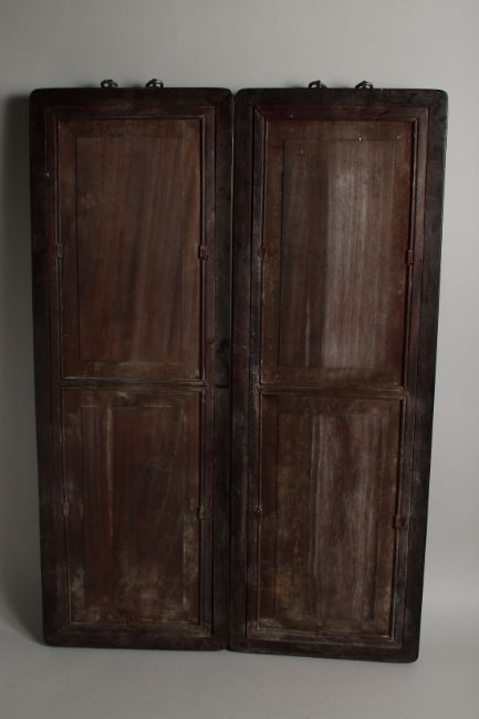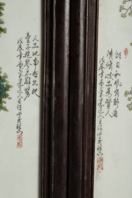 A PAIR OF MAHOGANY FRAMED CHINESE PORCELAIN PLAQUES.