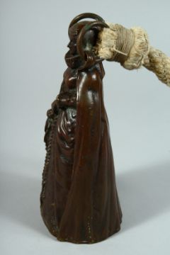 A GOOD 19TH CENTURY BRONZE BELL, AN ELIZABETHAN LADY with two rings holding a rope handle.