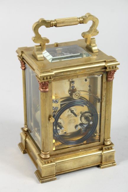 A GOOD GOLDSMITHS & SILVERSMITHS BRASS CARRIAGE CLOCK with repeat action and column supports.