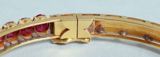 A GOOD 18CT GOLD RUBY SET BANGLE.