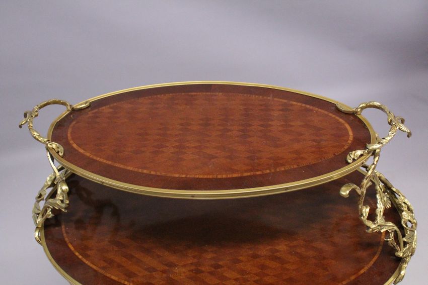 A FRENCH MAHOGANY TWO TIER ETAGERE with ormolu mounts and curving legs.