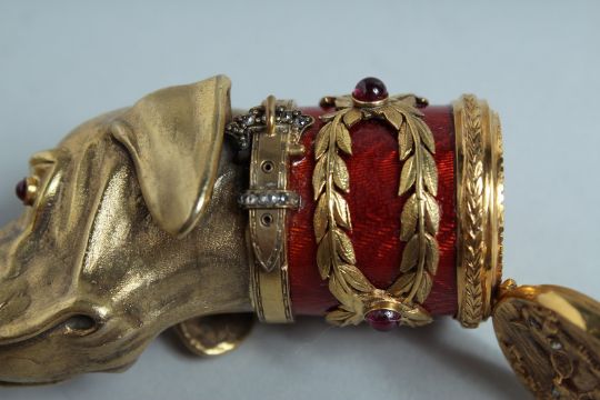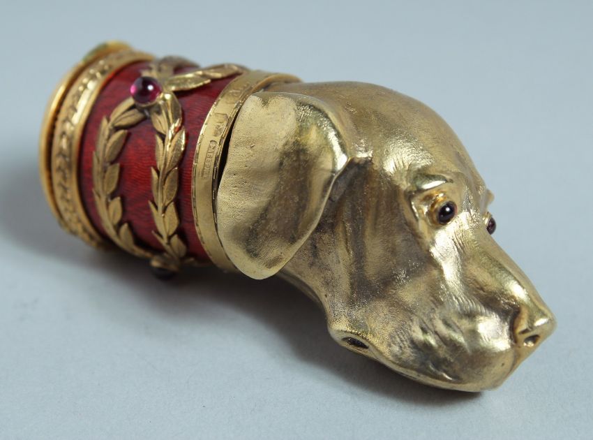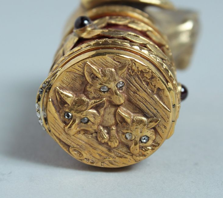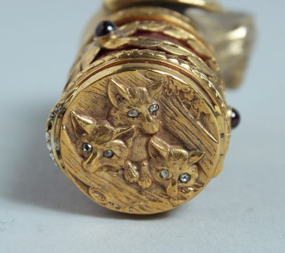 A GOOD RUSSIAN SILVER GILT AND ENAMEL DOG'S HEAD SNUFF BOX, the head with three fox cubs, set with diamonds and cabochon stones.