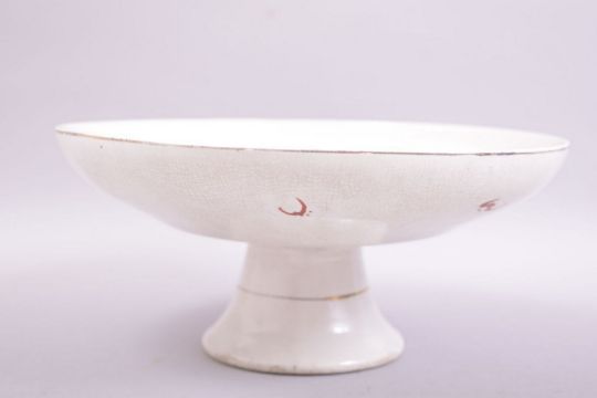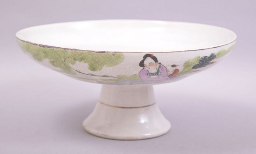 A CHINESE PORCELAIN PEDESTAL DISH / FRUIT BOWL, painted with two seated figures next to a tree.