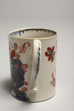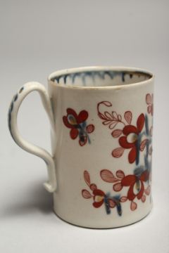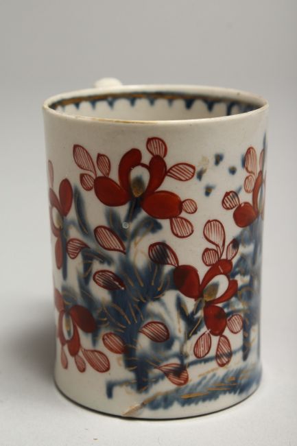 A LIVERPOOL MUG, probably Wm. Reid, painted in an underglaze blue and over glaze red with a tree and hollow rock.