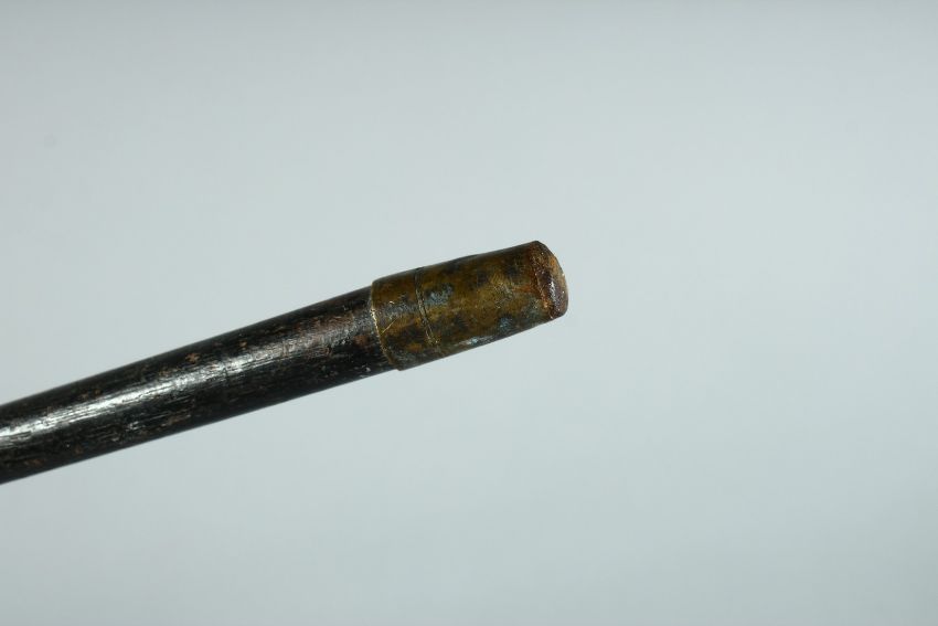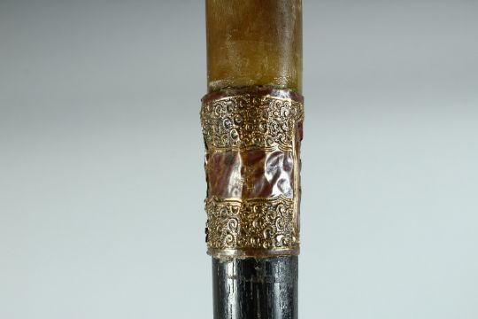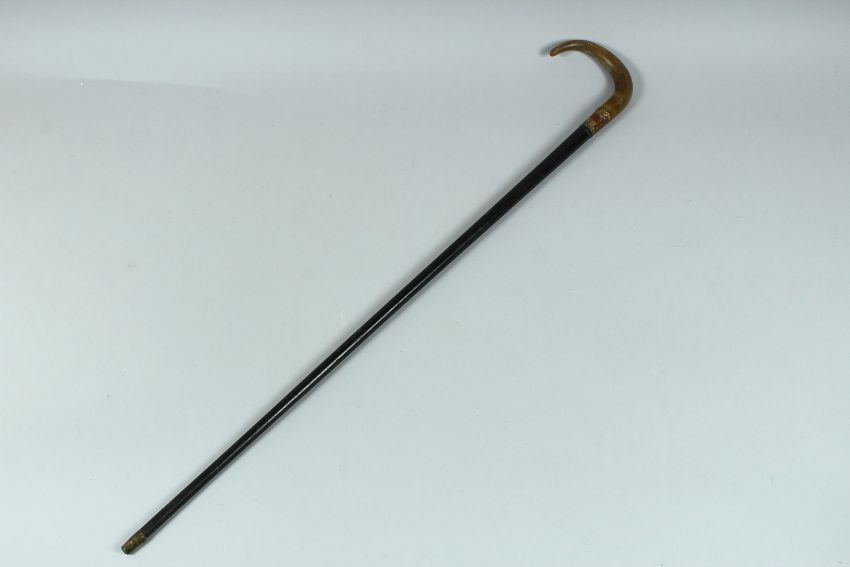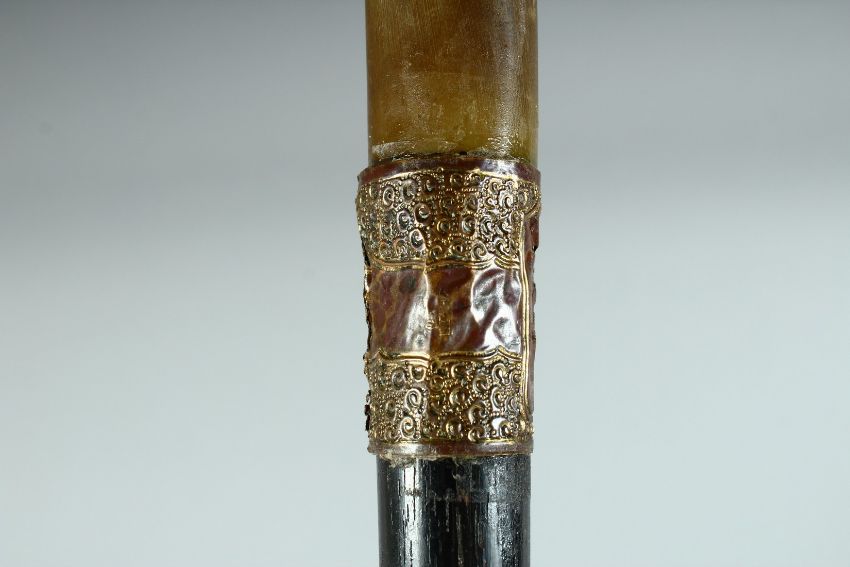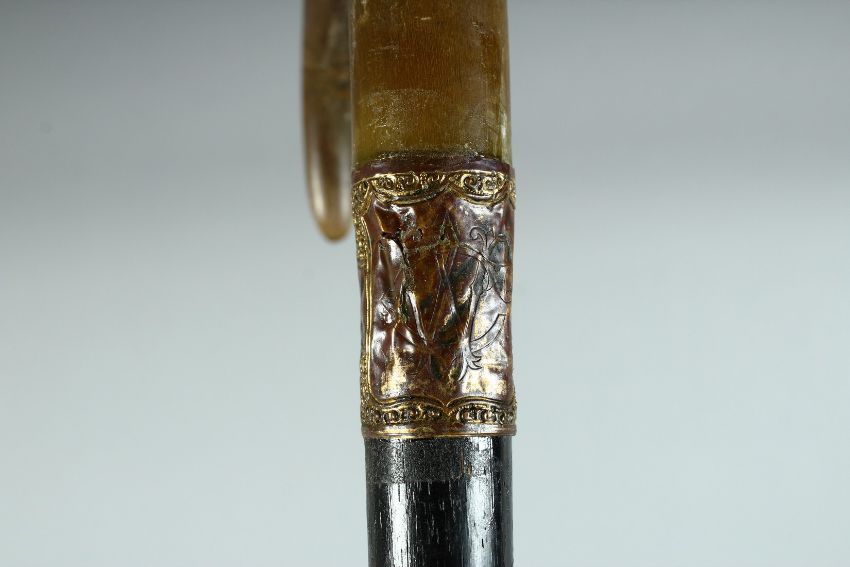 A VICTORIAN WALKING STICK with Rhino handle and gilt band.,