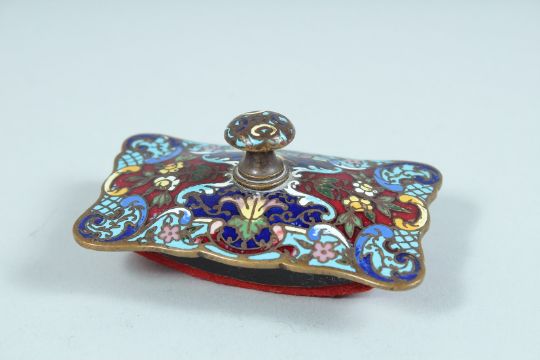 A GOOD 19TH CENTURY FRENCH CLOISONNE ENAMEL SIX PIECE DESK SET including, Easel Clock, a pair of Candlesticks, Inkstand Blotter, Letter Rack.