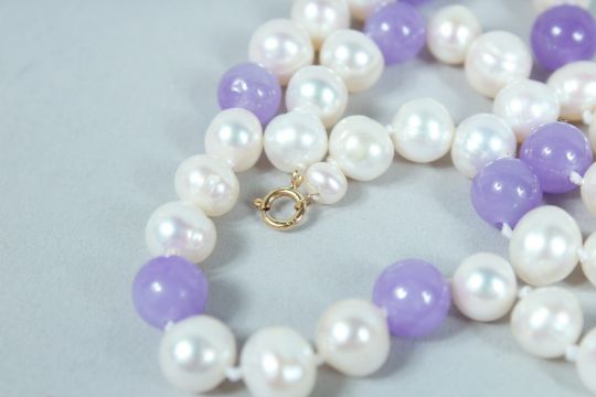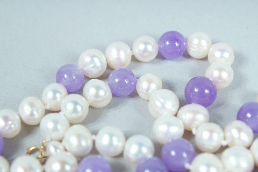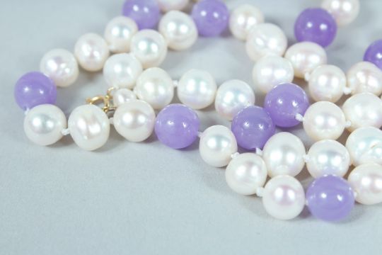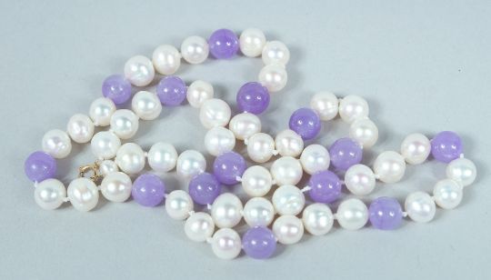 A PEARL AND LAVENDER JADE NECKLACE.