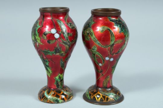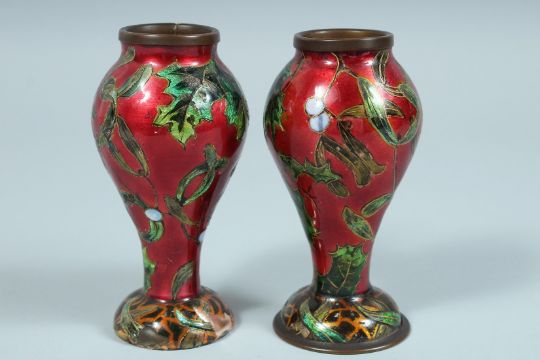 A SMALL PAIR OF FRENCH ENAMEL VASES