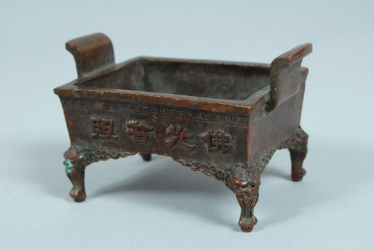 A CHINESE BRONZE TWO HANDLED RECTANGULAR CENSER