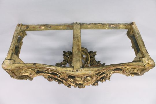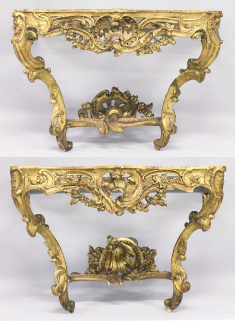 A VERY GOOD NEAR PAIR OF 18TH CENTURY CARVED AND GILDED CONSOLE TABLES with serpentine marble tops. the base carved with scrolls, acanthus and shells