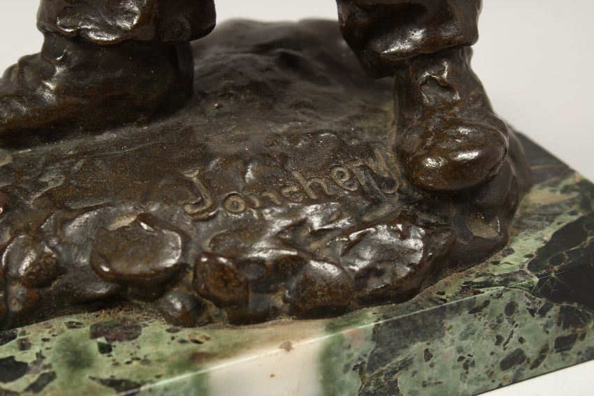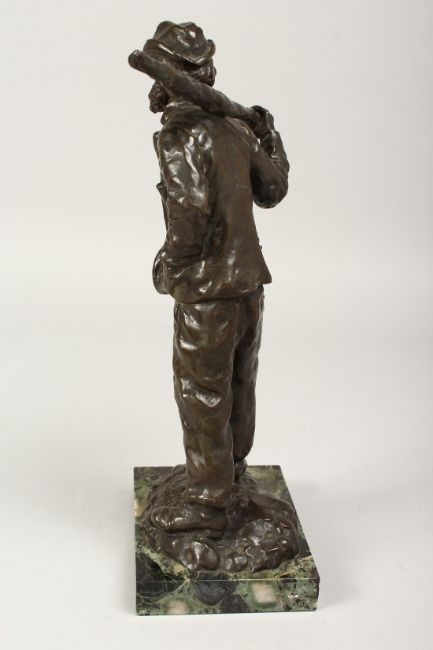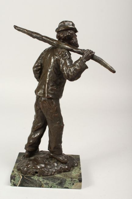 A GOOD BRONZE OF AN OLD MAN CARRYING A STICK OVER HIS SHOULDER.