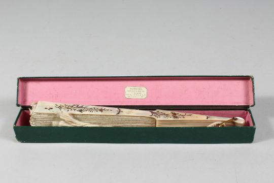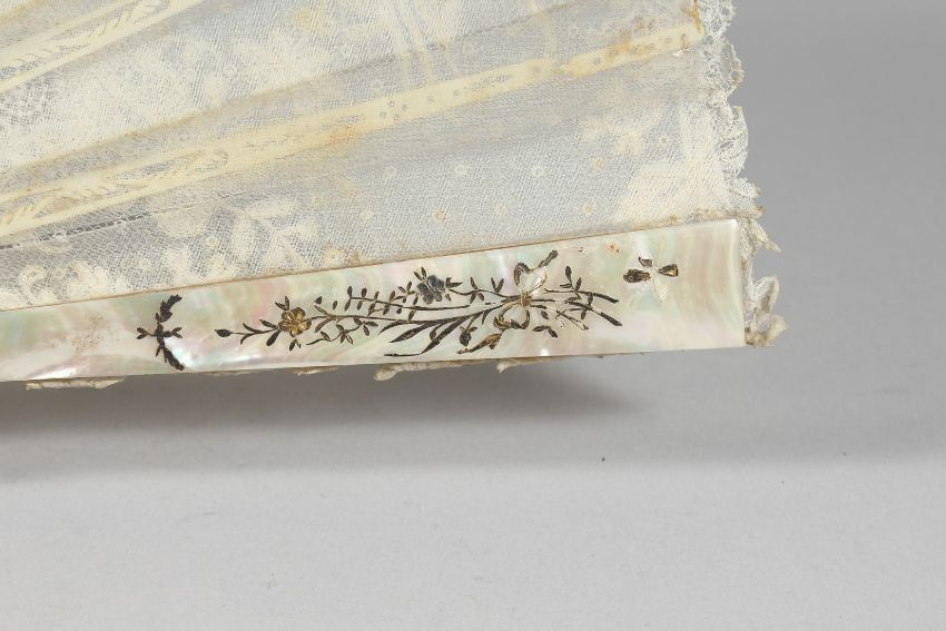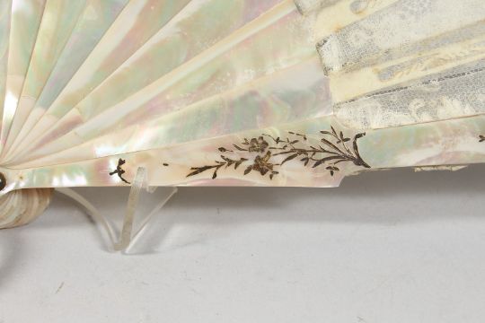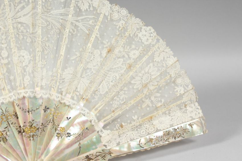 A GOOD VICTORIAN MOTHER OF PEARL AND LACE FAN.
