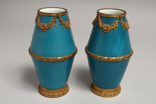 A GOOD PAIR OF SEVRES BLUE GROUND VASES with gilt swags.