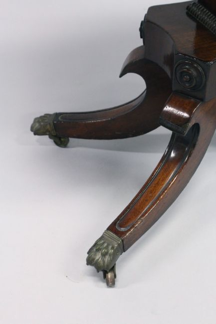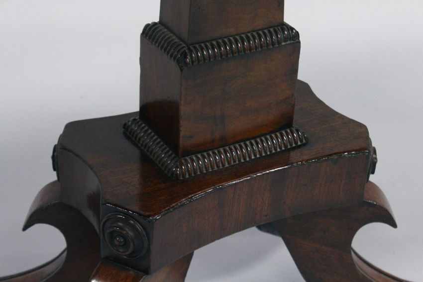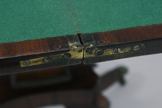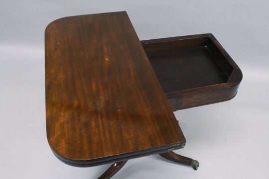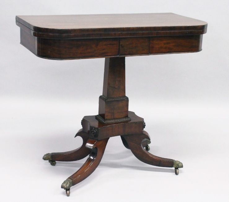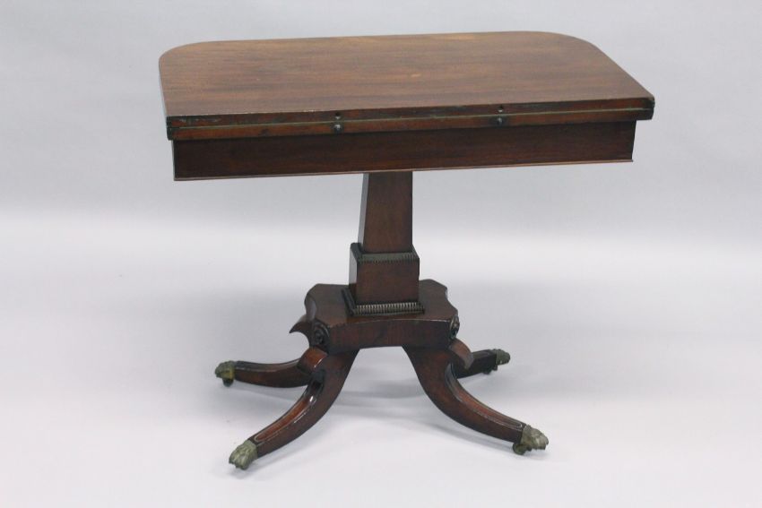 A REGENCY MAHOGANY CARD TABLE with plain rising top and green baize interior, on a centre column support ending in quadruple curving legs with brass casters.