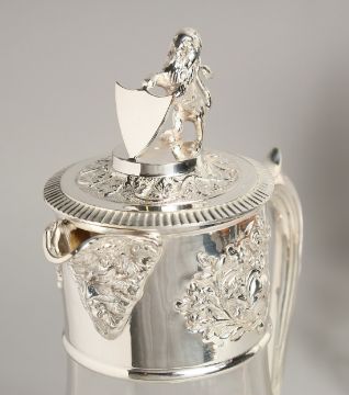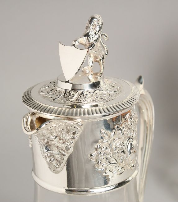 A PAIR OF GLASS AND PLATE CLARET JUGS.