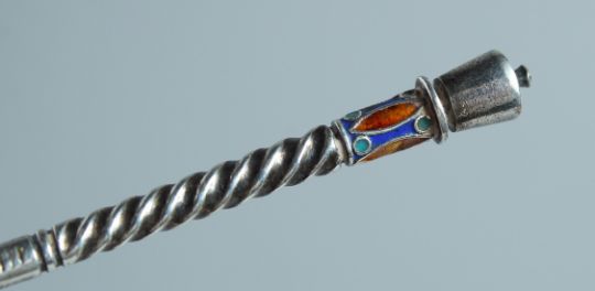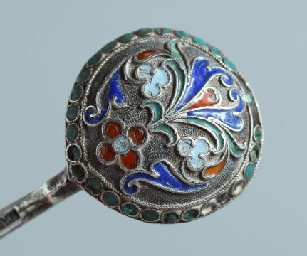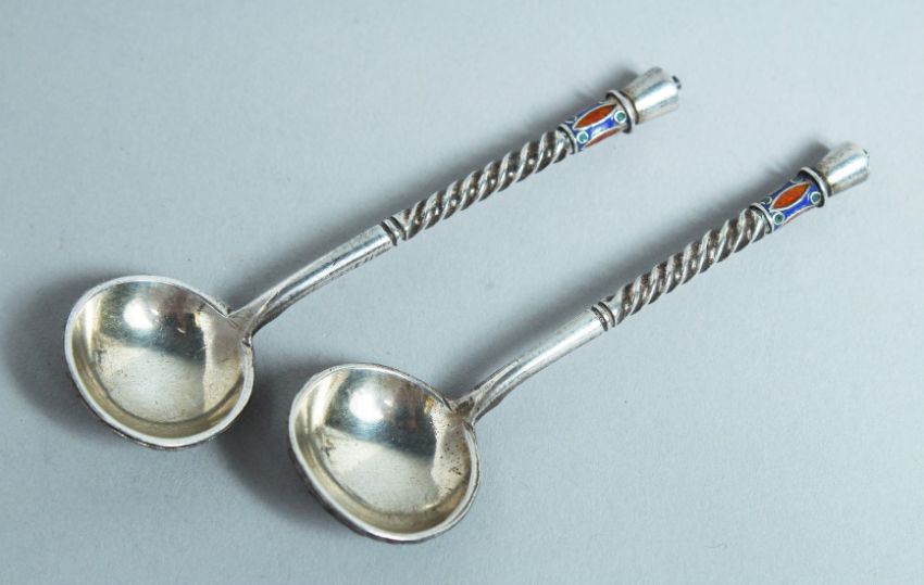 A PAIR OF RUSSIAN SILVER AND ENAMEL SPOONS.